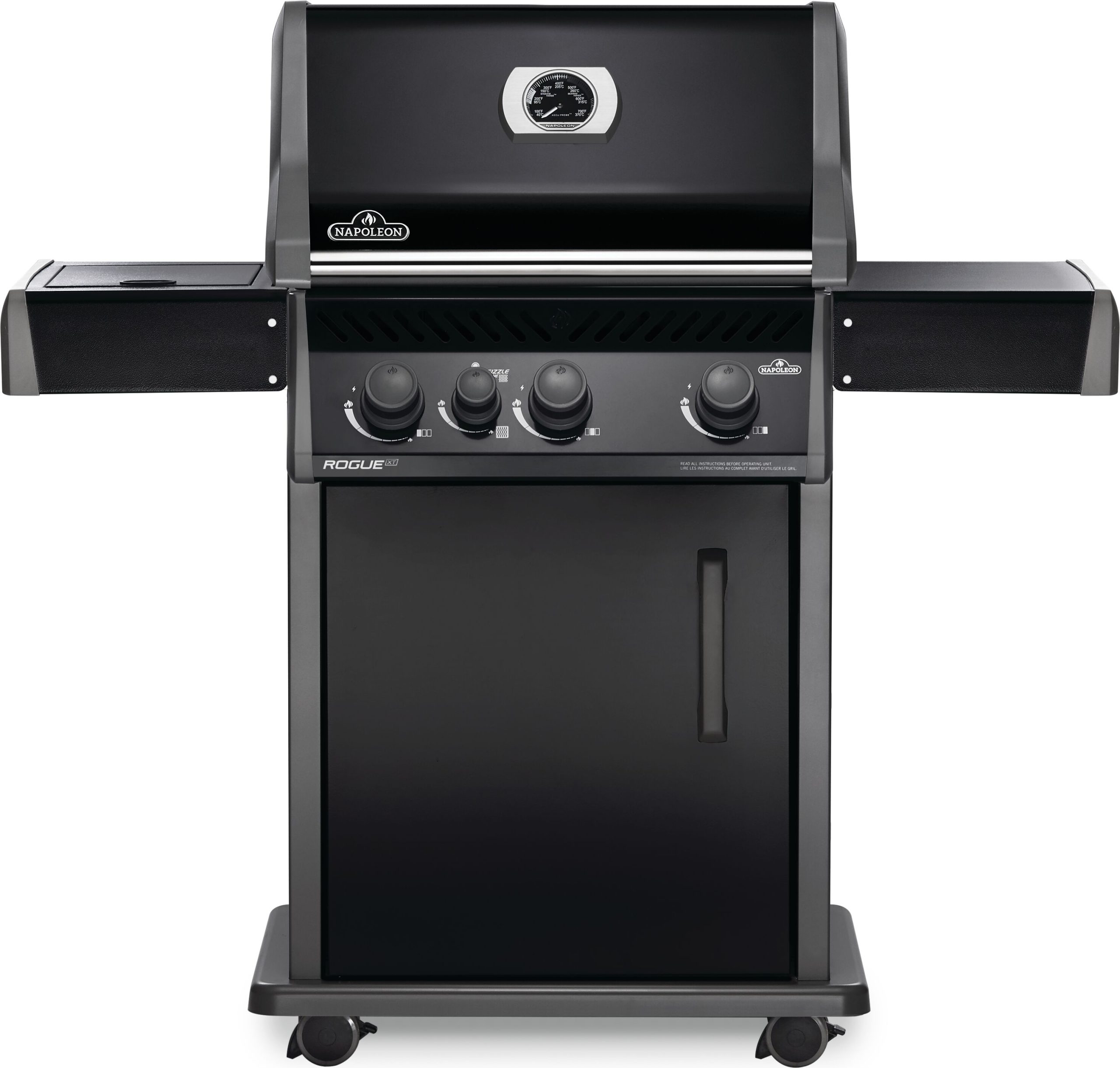 Napoleon's Rogue® XT 425 Black Hood Propane Gas Grill with Infrared Side Burner has three burners, cast iron grids and a high top lid. This grill lights easily, every time, with a battery-free ignition. Grill the perfect steak using the integrated sizzle zone side burner or use it to make sauces and sides while grilling, and searing on the main area. The durable materials are both stylish and easy to maintain.